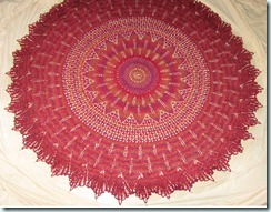 I have been absent from the blogosphere for the summer as I have been recovering from a big op in May. Happy to say that all is well and I am due to start a phased return to work next week. I feel more well than I have done in years. You will be glad to hear that I have not wasted my summer sick leave and have been busy on the craft. A lot of what I have been doing are presents for Christmas and birthdays, so I won’t be posting them until after they reach their recipients. Knitting-wise, I made a rather fetching pair of ‘Circle Socks’ for my mum from Noro Sock Yarn, and a Sun Ray tablecloth for Christmas. I used Regia sock yarn as it is machine washable and would come up bigger than lace weight crochet yarn.